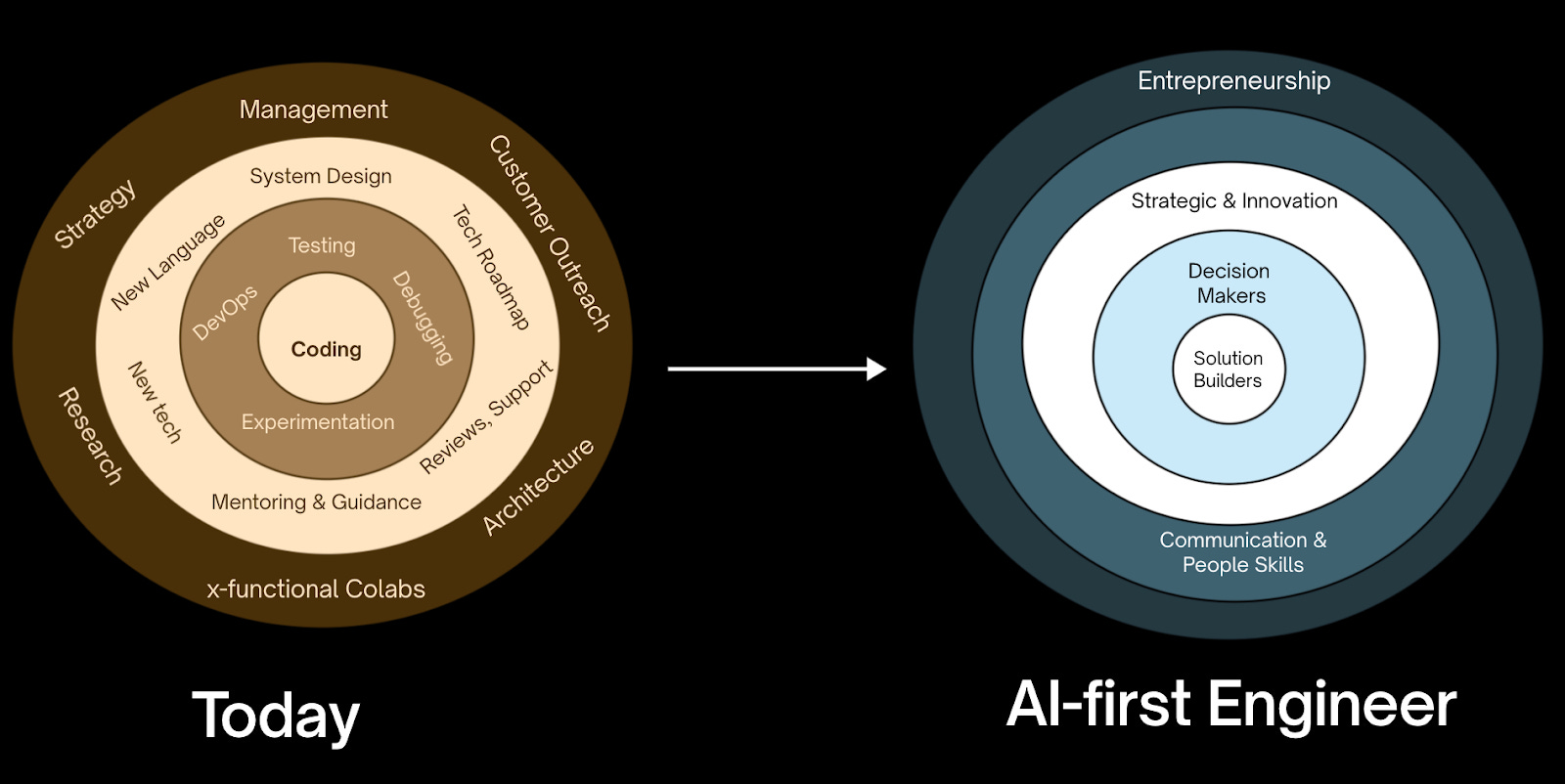 As AI capabilities are integrated throughout the developer stack, they empower both generalists and specialists to become solution builders. These builders can create comprehensive solutions with advanced technical knowledge and broad execution skills. With AI copilot support, they can turn user issues into complete solutions quickly, reducing development time from several quarters to just months. Solution builders resemble Solution Architects but also handle development tasks, customizing features to meet user needs with AI's assistance. Meanwhile, specialized engineers can learn to create complete solutions with AI's help, covering coding, testing, experimenting, and launching. As an engineer, you might have to pick skills in these three layers