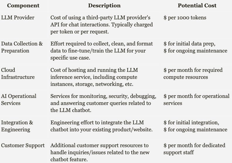 As your user base grows, so do the complexities of scaling your AI solution. This includes not just linear cost increases, like API calls, but also strategic investments in cloud infrastructure to ensure smooth user experiences. Continuous improvement, through data collection and model fine-tuning, remains essential to keep your AI offerings relevant and effective. At minimum, you will need to spend on the following components.