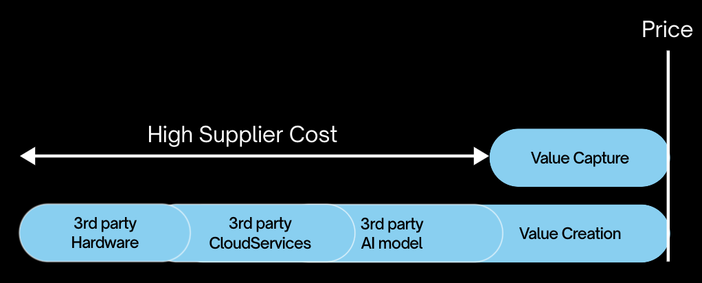 Value creation in the AI domain happens when customers are willing to pay more for your product than it costs to develop and maintain the AI solution. This includes all expenses from AI model development to cloud services and specialized hardware. However, the real game-changer is value capture - the portion of created value that your company retains after covering the costs, including those hefty fees paid to AI solution providers.